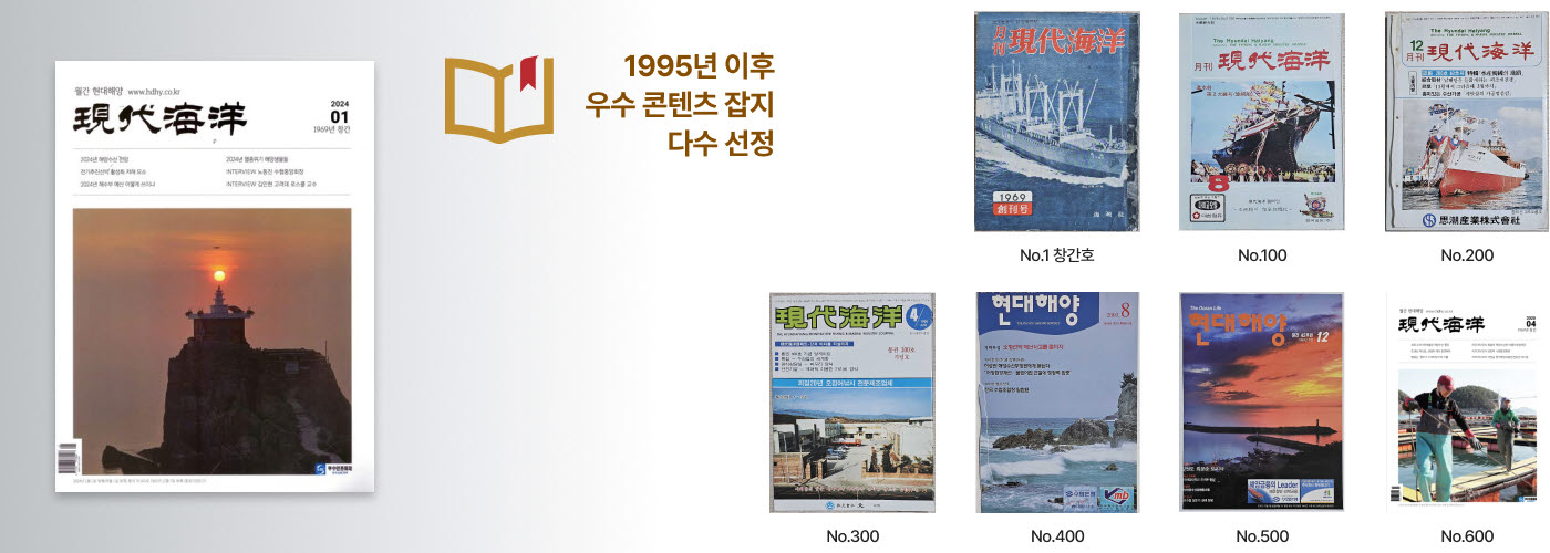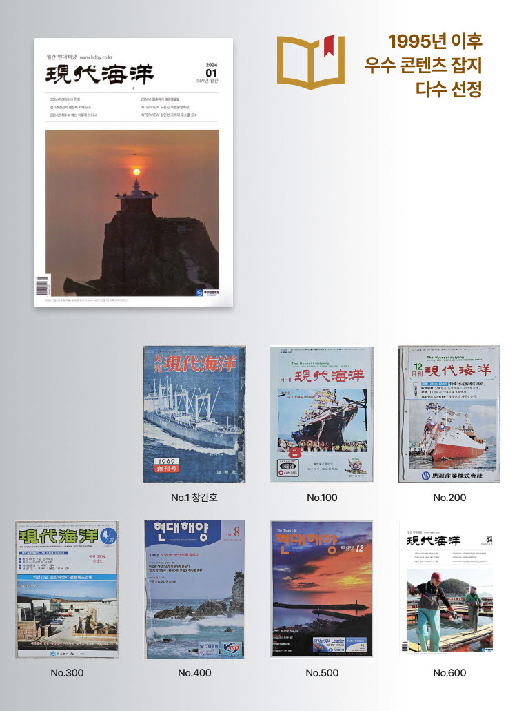 정보 중심의 미니멀 디자인(Minimal Design)으로 전통과 격조를 갖춘 월간 ‘현대해양’은 매월 1일 발간되고 있습니다. 전국 주요서점에 배포되고 있으며, 정책당국, 지방자치단체, 수협, 관계업·단체, 일반 구독자들에게 해양수산 동향을 파악할 수 있도록 정보를 정리 제공하고 있습니다.
